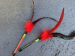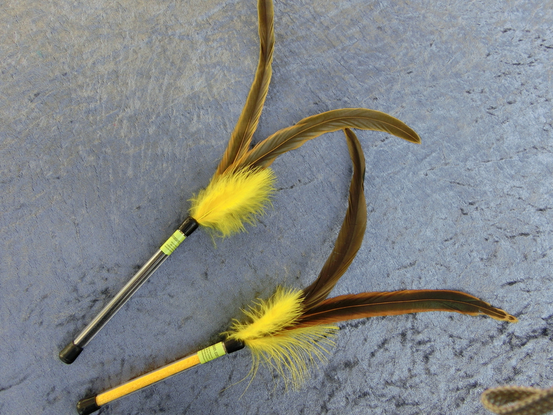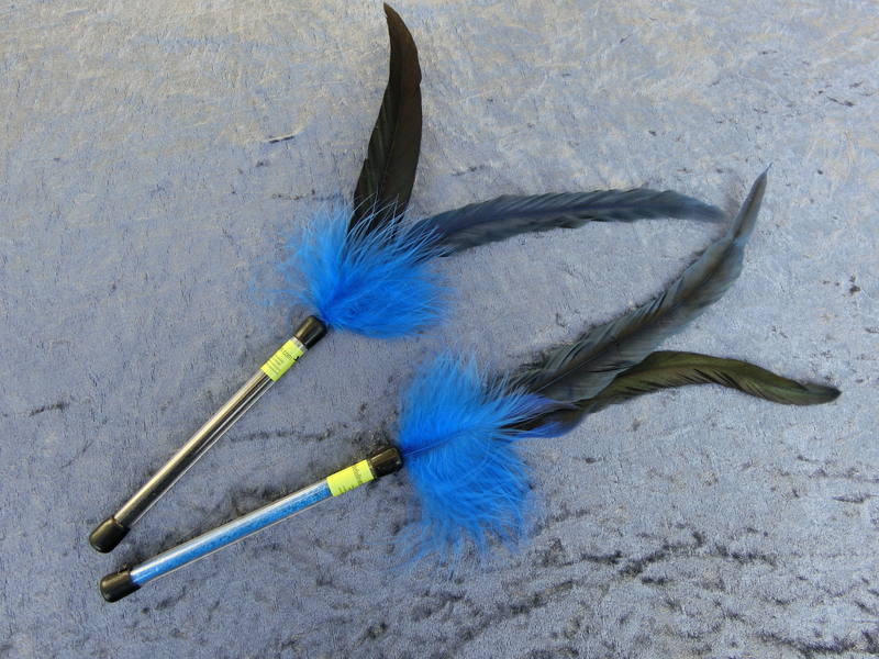 Dieses Federspieli hat eine Gesamtlänge von ca. 41 cm. Die Hahnfeder besteht immer aus 2 langen Hahnfedern und kleinen, flauschigen Marabufedern am Abschluss. Der Griff wird hergestellt aus einem durchsichtigen Acrylrohr und ist mit Zierkies gefüllt.